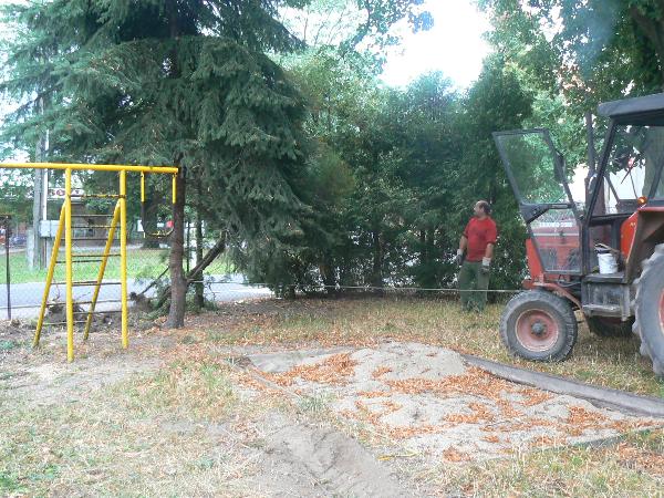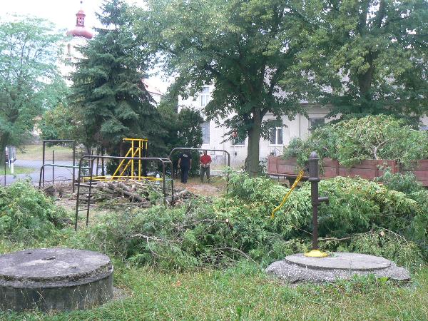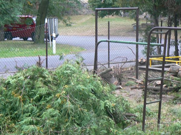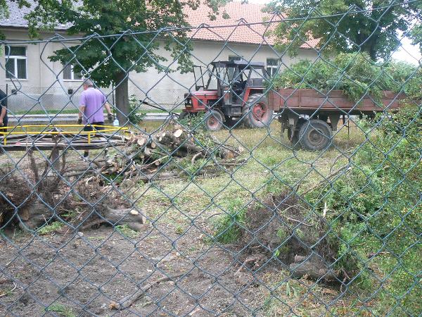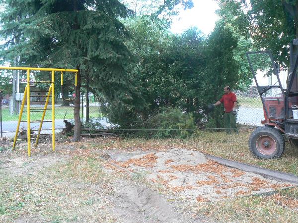 Kácení tůjí u plotu ve škole